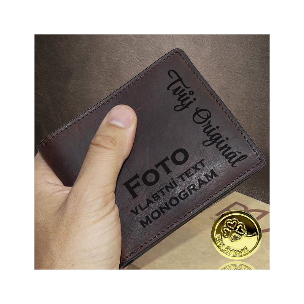 Tmavě hnědá SLIM kožená peněženka ROYAL Leather s monogramem a vlastním textem + Akce - zlatá mince Pro štěstí ZDARMA