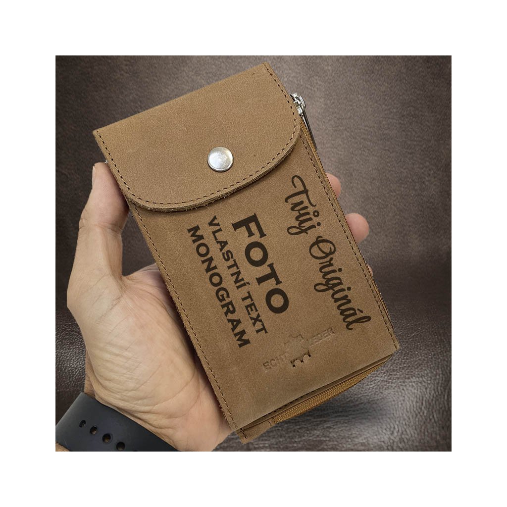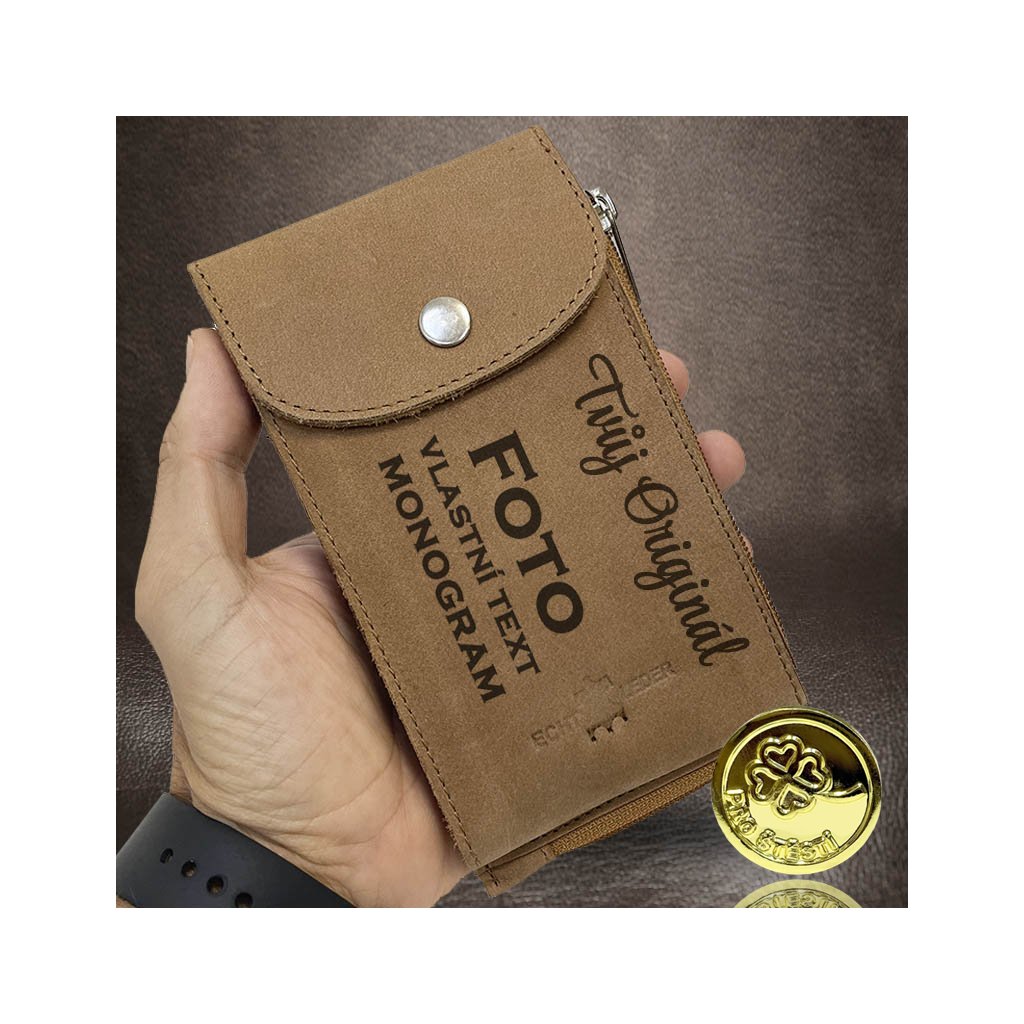 Univerzální 2v1 hnědá kožená peněženka, taška, kabelka s monogramem, vlastním textem a fotkou + Akce - zlatá mince Pro štěstí ZDARMA