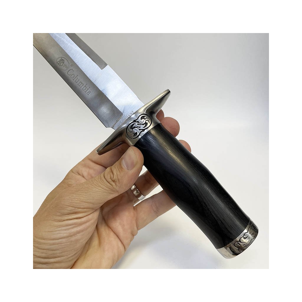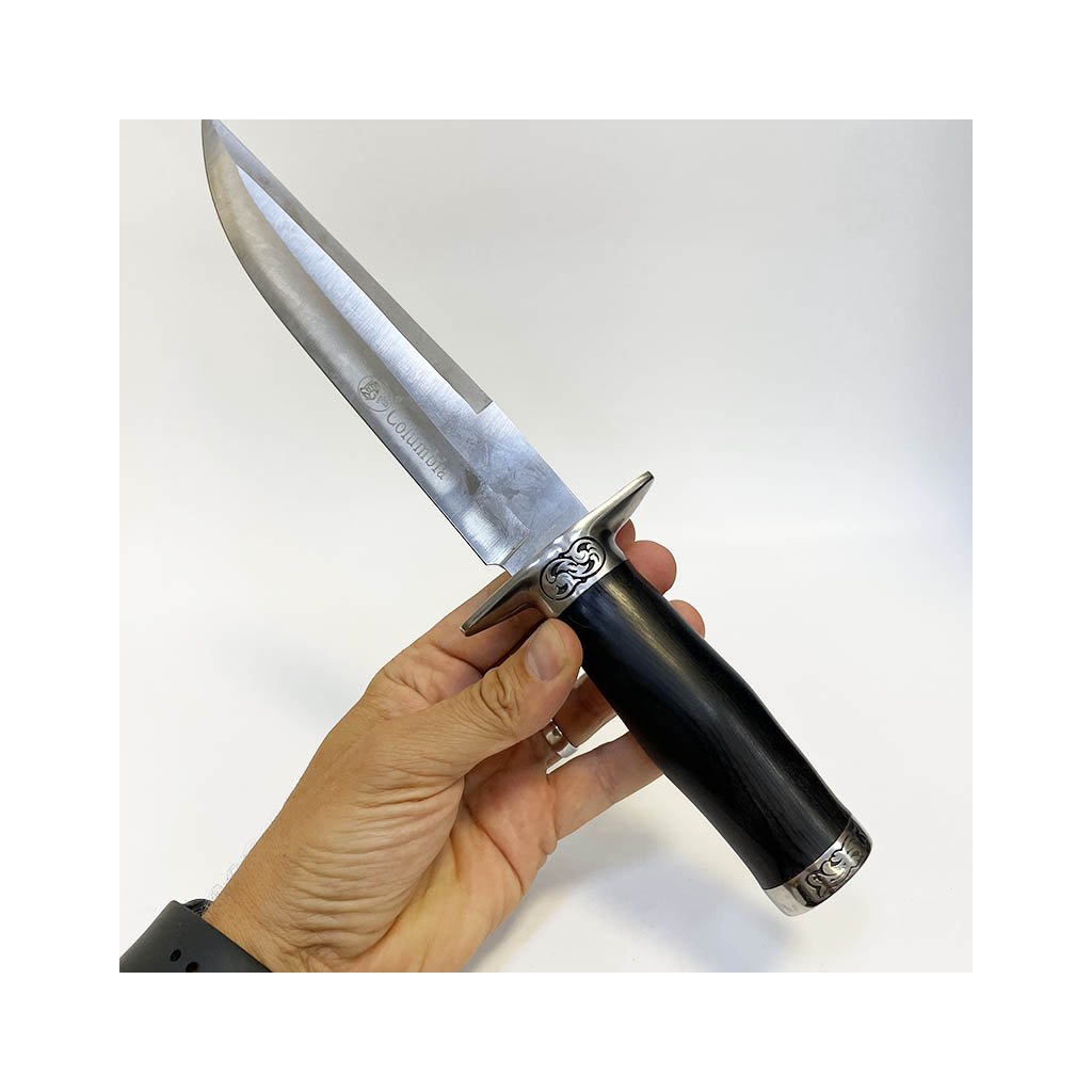 Nádherný kousek. Pořádný kus poctivého nože. Velký lovecký nůž s hladkou čepelí, zapuštěné do krásné skvěle padnoucí dřevěné rukojeti. Součástí vypolstrované textilní pouzdro s možností přichycení na pásek.