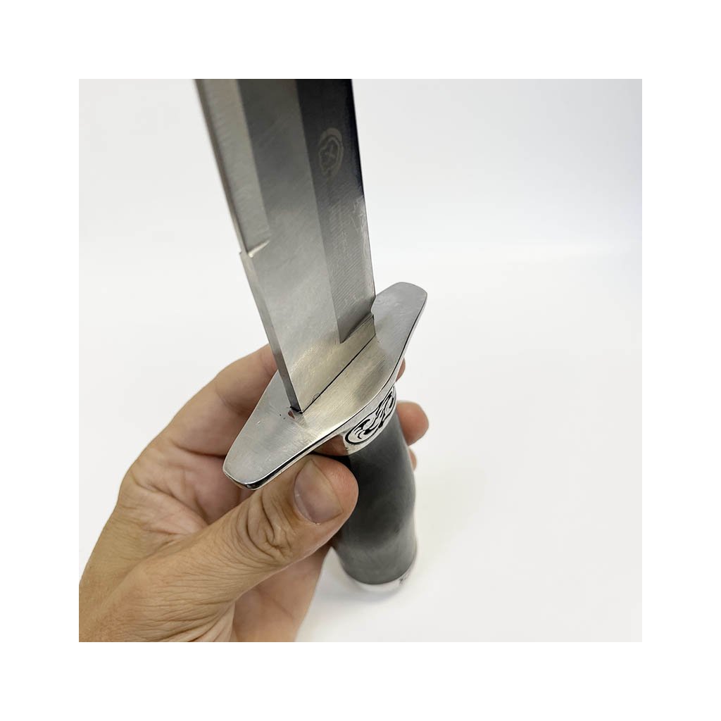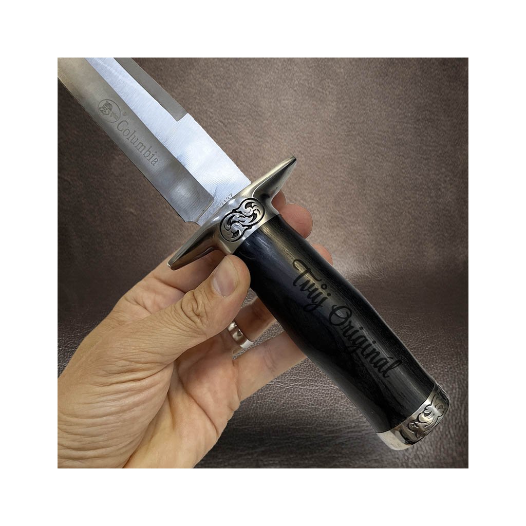 Poctivý lovecký nůž s tmavou čepelí, dřevěnou rukojetí a pouzdrem. Včetně možnosti gravírování vlastního monogramu – skvělý dárek pro lovce i fajnšmekry.